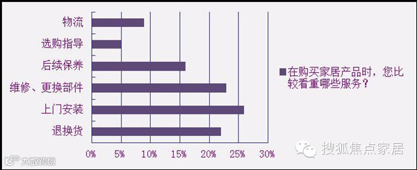 而在产品购买阶段,消费者已经为售后服务做了打算。其中,退换货、上门安装、维修/更换零部件三选项不分伯仲,为消费者最为关注,这与家居产品的属性不无关系。作为大件耐用消费品,往往并不如快速消费品那样,可以迅速暴露问题。并且一旦暴露问题,消费者也难以单独处理,对企业的依赖性比较强。