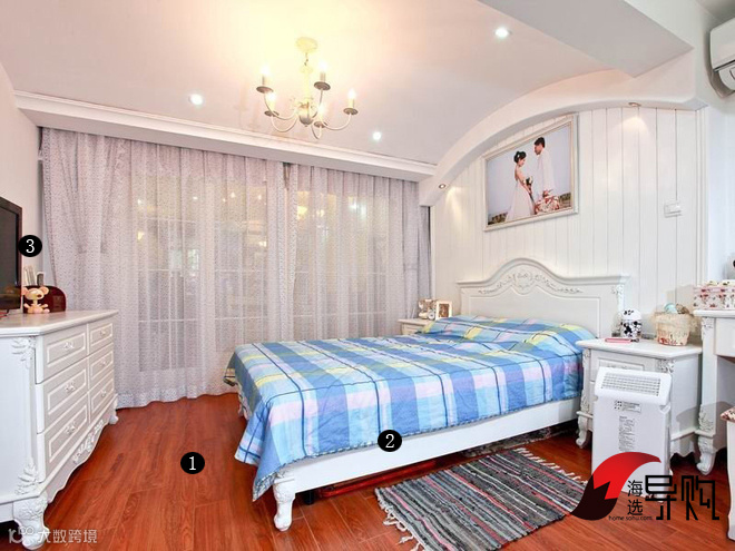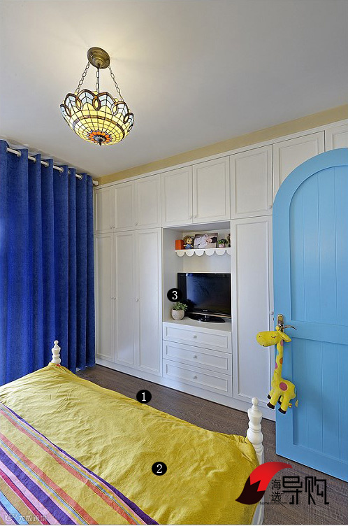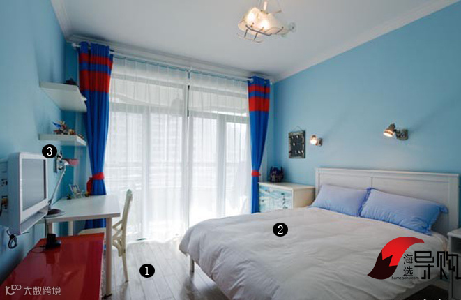 简约的海蓝色墙面与原木色地板相结合,在背景墙上以白色纱幔作为背景墙装饰,简单而又赋有情调,两盏小灯、海洋元素装饰更是烘托出整个卧室的温馨感。蓝色能平复情绪,令人精神镇定,同时能降低血压和心跳,从而有助快速入眠。只是蓝白色的色调80后需要好好打理,不要变成蓝灰哦~