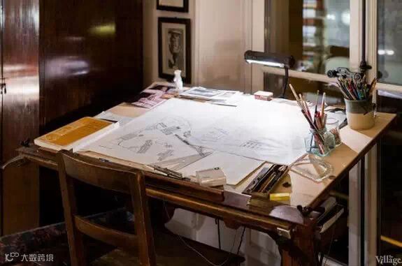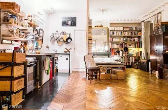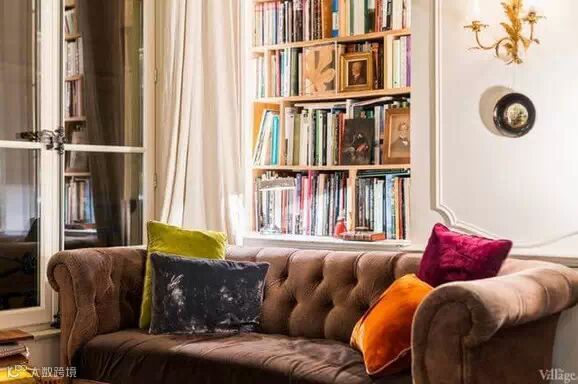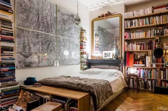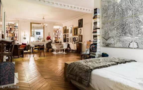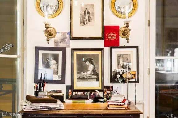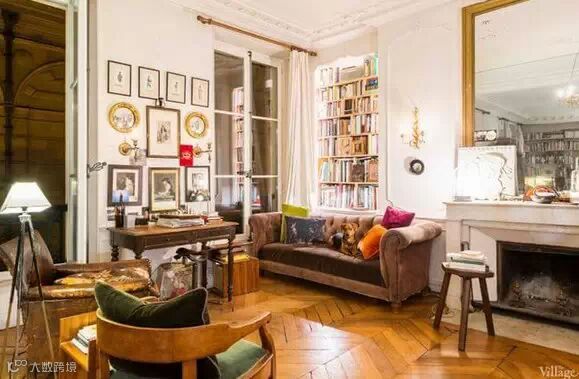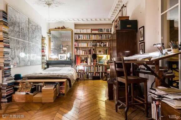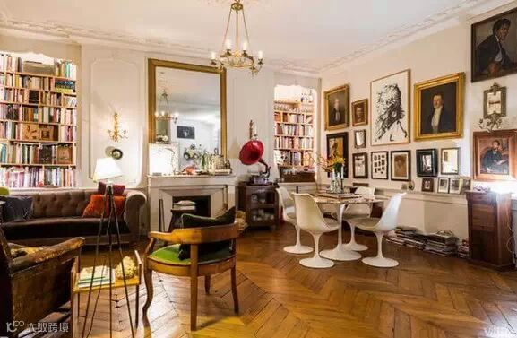 这座巴黎公寓面积并不大,乍眼看上去,甚至会觉得这是一个杂货铺,整个空间被布置得满满的,人字形的硬木地板,壁炉,巨大的镀金镜子,看似年代久远的皮革座椅沙发,经典的古董吊灯,满墙的人物肖像,成堆的旧书籍和行李箱……似乎每一寸空间都能找到主人的影子。尽管空间不大,主人却可以安心的窝在任何一个角落。