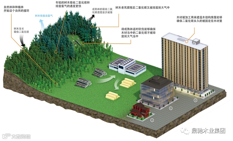 树木在生长过程中,通过光合作用,以碳化合物的形式储存二氧化碳。与其它不可再生材料相比,它们的碳锁定能力使其成为更环保的选择。它是我们为数不多的可以利用太阳生长同时吸收有害一氧化碳的结构建筑材料之一。将木材加工成建筑结构框架等大型的、耐用的产品,可以扩大木材的固碳作用,进而缓解温室效应。一座典型的木结构房屋可以储存28吨碳,相当于一辆家庭汽车连续行驶5年的碳排放,这是其它材料完全无法达到的固碳能力。