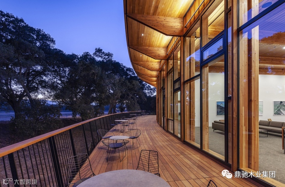 建筑依山而建,与周围环境融为一体,最大限度的保留当地优美的自然风貌。总建筑面积为7662.7m²,其中木结构部分面积为5500m²,包含客房16间、雅间7间、多功能厅1间、零点餐厅1间。位于下一层的1800㎡的恒温酒窖,可同时储存1200个波尔顿多标准橡木桶,为整个丘山谷片区提供葡萄酒交易及仓储服务,也为葡萄酒爱好者提供了绝佳的交流互动平台。