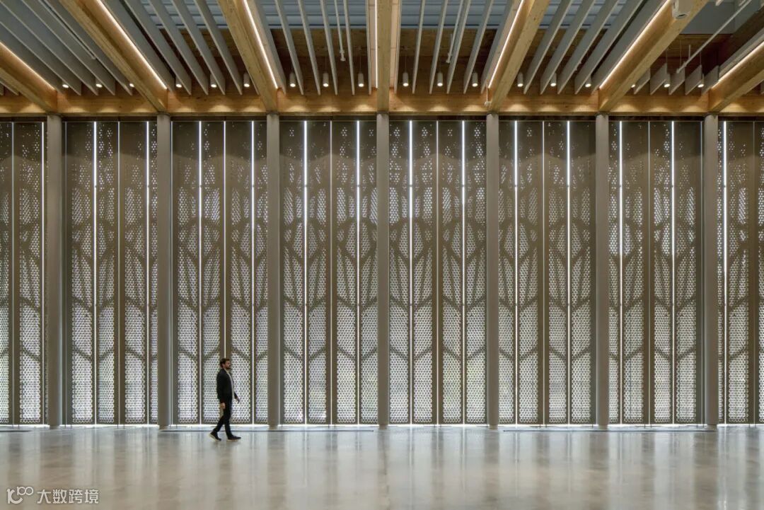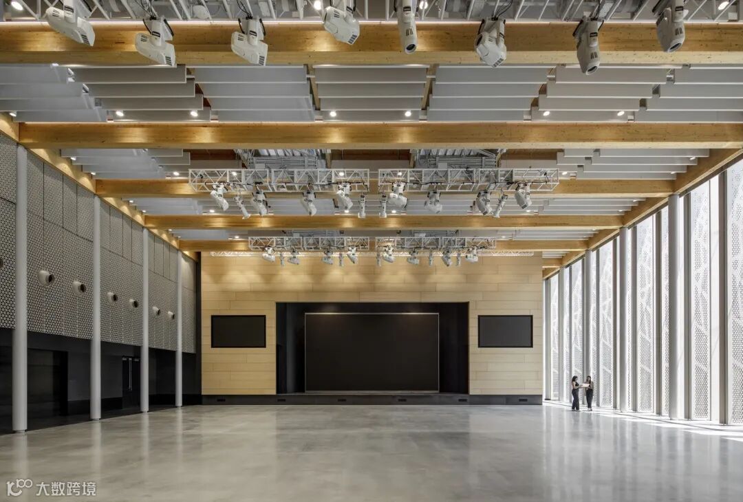该场地由自然光照亮,并使用温暖的有机材料,具有特色正交胶合木(CLT)由十个支撑的屋顶板胶合层压木材(胶合木)梁。横梁跨度近25米,支撑着中心的锯齿形天窗结构和植被屋顶。巨大的跨度使内部没有柱子,完全灵活——它可以容纳多达 700 人,用于从招聘会和全体员工会议到艺术表演和社区聚会的各种活动。