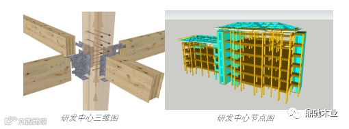 全省首个装配式木结构建筑示范工程。研发中心采用胶合梁、胶合柱、CLT 等部品部件,装配率高达 75%,即该项目有四分之三都是由预制部品部件在工地装配而成,采用装配式植筋技术、隅撑节点增强技术、自攻螺钉增强技术等,将装配化理念贯穿设计、制造、施工全过程,被评为山东省装配式建筑示范工程。建设过程中采用 BIM 技术,智能选取构件,并统计木材方量与木结构尺寸,模拟整体建筑连接、管道碰撞检查等,大大提高了施工速度和工程质量。