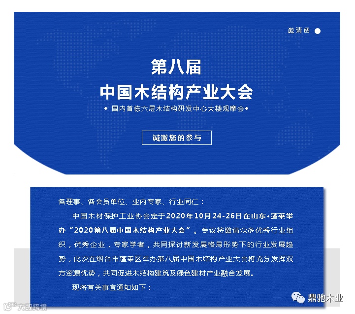 山东鼎驰木业有限公司、中国木材保护工业协会(中国木结构产业联盟)为加速推进木结构预制化、装配化、工业化,鼓励木结构建筑节能环保技术推广应用,定于2020年10月24日—26日在山东省蓬莱区欧乐堡国际酒店联合主办“第八届中国木结构产业大会”,共同促进木结构建筑及绿色建材产业融合发展。