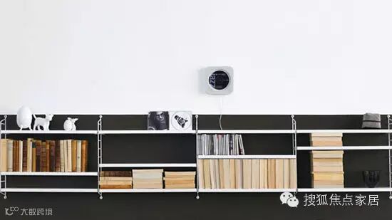 黑白墙面与白色层板的搭配使书架如同一幅立体画框,框住了一幅幅以书为主角的画作。而层板还可以调节书籍竖直或水平摆放的方式,使墙面更具节奏感。