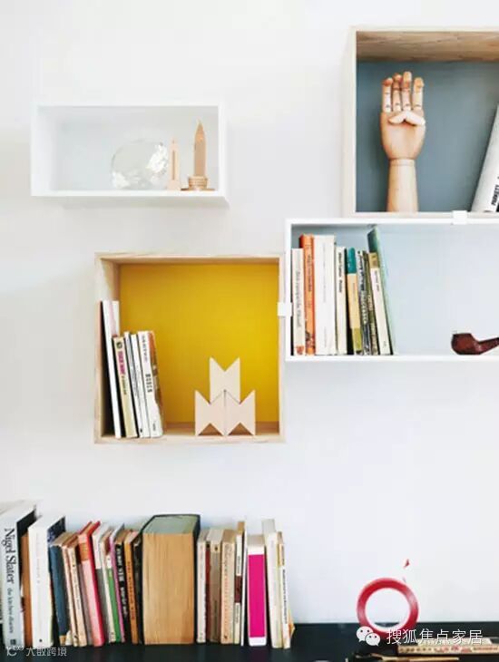 像这样小巧的方块式层架其实可以任意布置在墙面上,还可经由不同形状与颜色的搭配,拼接出均衡的画面感。如此一来,只要放入书籍,一个个漂亮的装饰窗就打造出来了,其在收纳书籍的同时,还可以装点家居,一举两得。