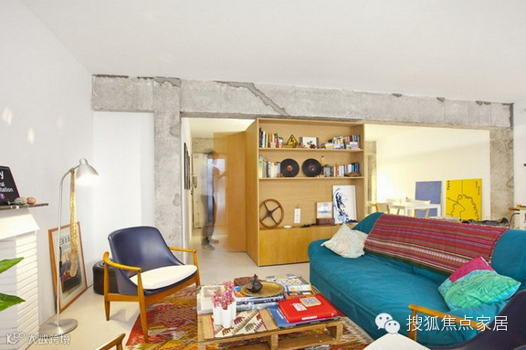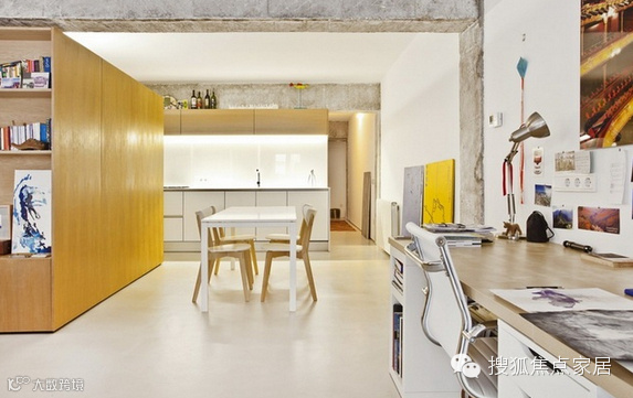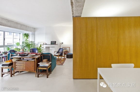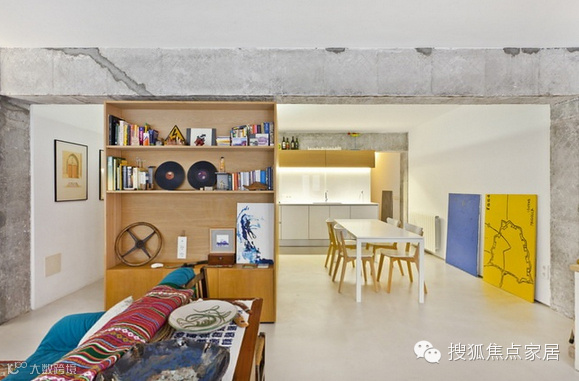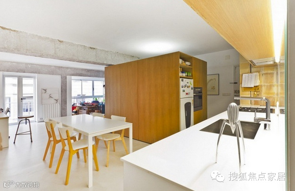 这座公寓位于一栋建于60年代的老建筑中,主体结构为钢筋混凝土,由于年久失修,房屋已经空置了几年,Vila Segui Arquitectos设计师将它重新设计,将老房的横梁和立柱都保留了下来,拆除原先的格局,现在开放式的空间除去了遮挡物,显得十分明亮舒适,木质“盒子”既是厨房储物柜也是主人的衣橱,更是空间中的一个亮点!