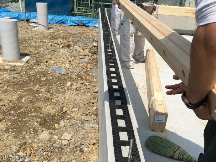 混凝土基础墙顶面上,铺设黑色的塑胶材质的专用通风垫块。