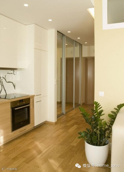 即便空间再小,也要温馨舒适,该案例提供了非常好的解决方案。37平米的空间内,仅有一条L型通道,格局规划依据过道依次排开。玄关自是隐形衣柜,镜面“放大”了空间,对面是卫生间和卧室。厨房的高光泽度整体橱柜小巧实用,尽头连着双人餐桌,相当节约面积。客厅也是一样不缺,灵活的可移动单人沙发方便调节看电视的角度。墙面刷成了淡黄色,令人放松,营造出温馨美好的感觉。
