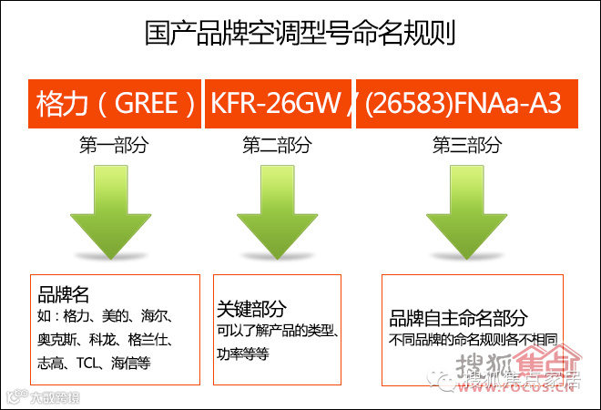由于强制规定,空调的第二部分型号命名规则是非常固定的,国产空调品牌产品都严格遵循了如下图所示的命名规律。详细情况参见下图: