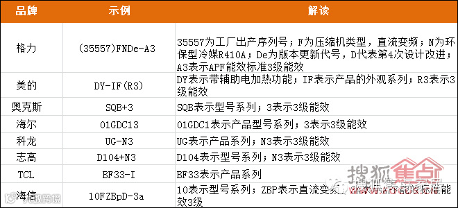 在各个品牌的第三部分型号命名中,通常可以发现一些具有参考价值的信息,其中,最具参考性的就是其末尾的数字,往往代表了这款产品的能效等级,有些甚至还标注了相关的能效评测标准,如A3就表明了是APF能效标准下的3级能效。