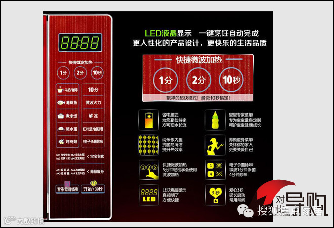 Midea美的微波炉采用了红黑渐变的外观,高贵典雅,金属质感的把手,喜庆却不失沉稳,超大观摩窗添加简雅线圈的花纹点缀,时尚又活泼,LED显示屏省电不刺眼,智能化菜单,一键烹饪,自动完成,更人性化设计。