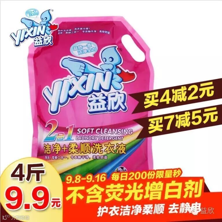 每日200份,9.9元2kg益欣洁净+柔顺洗衣液疯狂秒,买4减2元,买7减5元