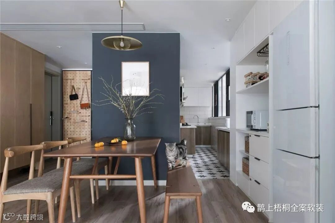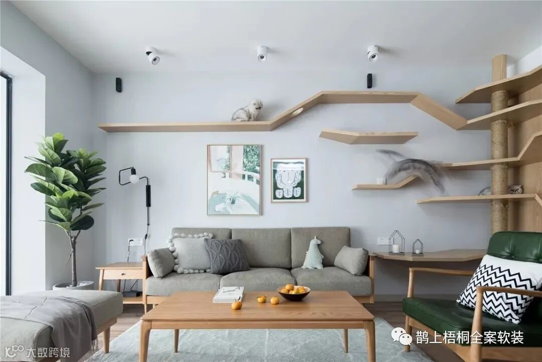 本套案例采用北欧风格,考虑到业主有两只可爱的喵星人,于是在客厅墙面和角落设计了猫爬架,不仅增加了屋内人与动物之间的互动和生活乐趣,更加有一种设计感。另外在这套案例中,吧台、地台、阳台并存,让空间的功能更加丰富多样,生活更加多彩。下面就一起来欣赏这篇北欧风案例。