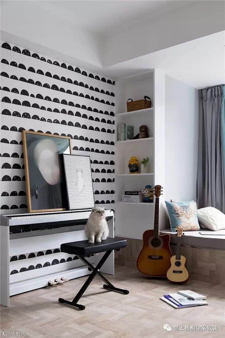 儿童房安装了榻榻米,旁边留出了宽阔的活动区域,练琴、弹奏、睡眠、玩耍都能在一个空间能完成。