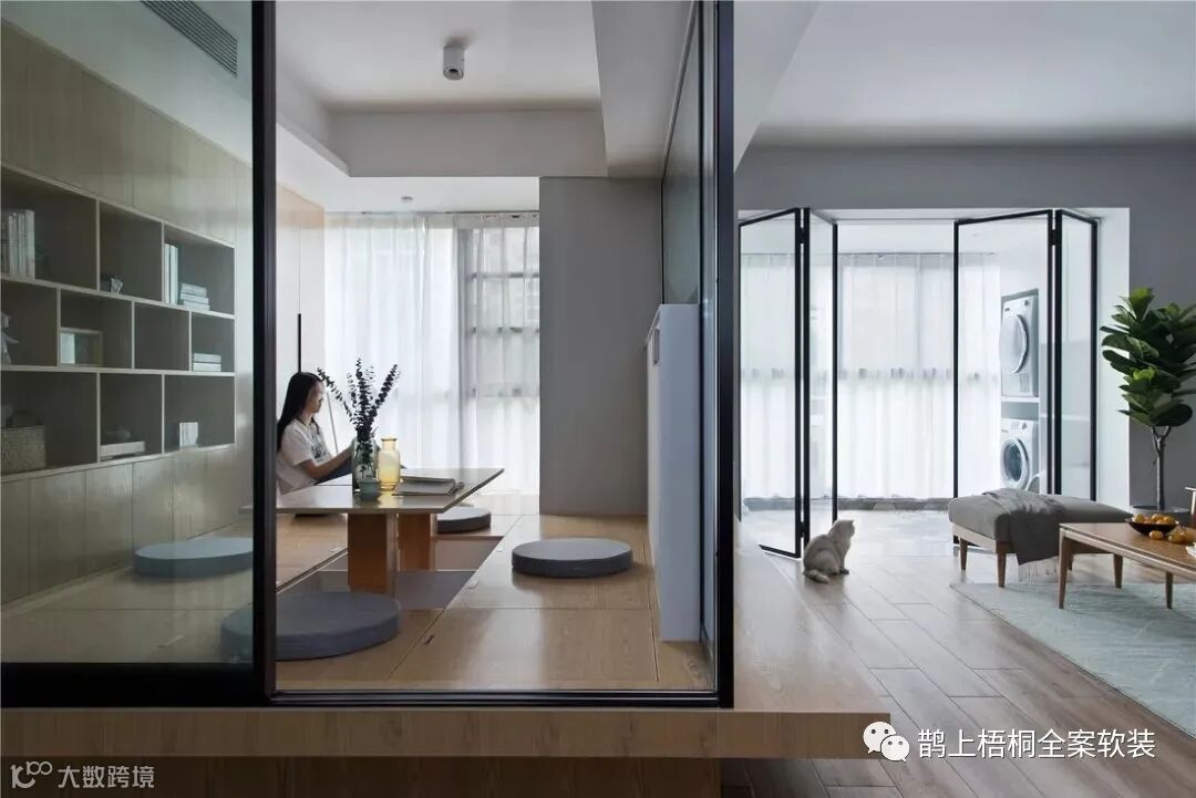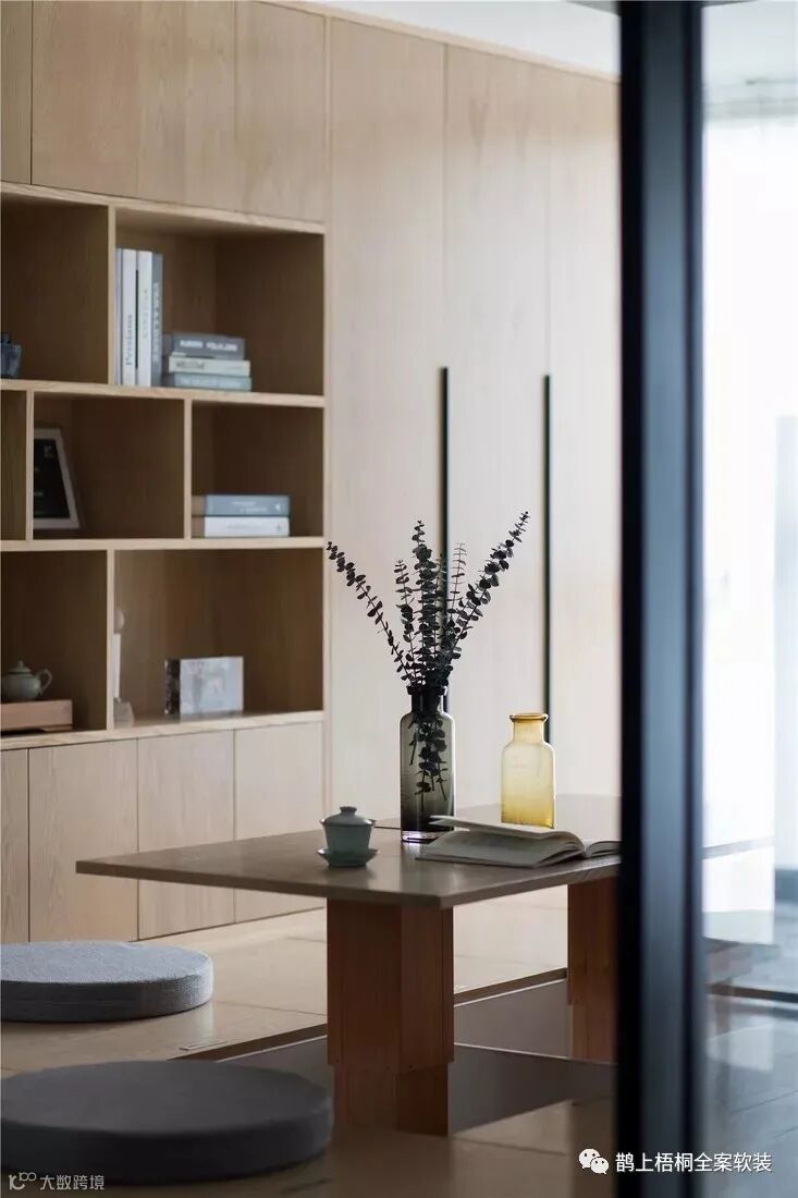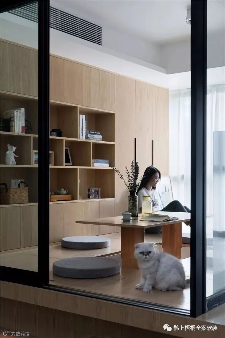 书房设计了地毯和升降式榻榻米,不仅有格调,朋友来了也有个饮茶聊天的好地方。后面是一整面书柜,各种书籍都能收纳于内。