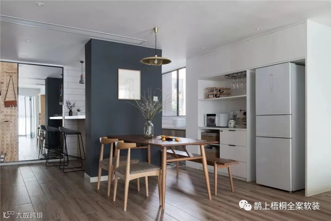 餐厅靠墙摆放的木质餐桌椅,简约又美观,上方一盏吊灯烘托舒适的用餐环境。餐边柜增加收纳,满足存放物品的需求,嵌入式的冰箱节省空间。无吊顶的设计,更不会带来压抑的用餐气氛。