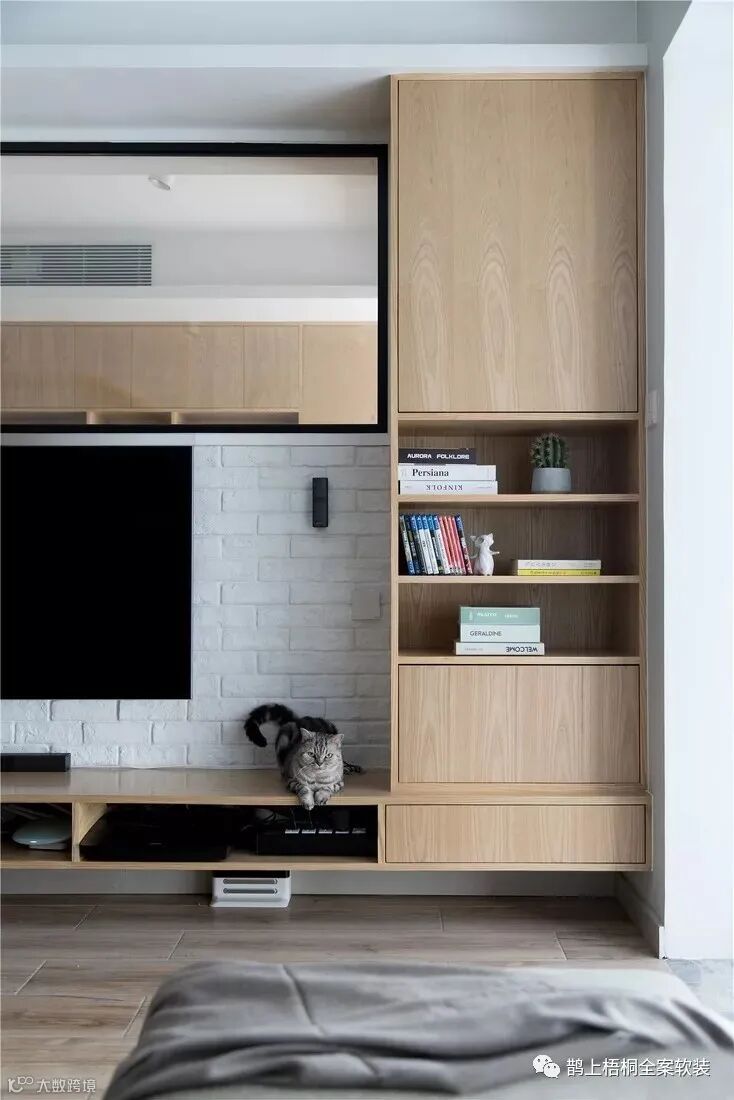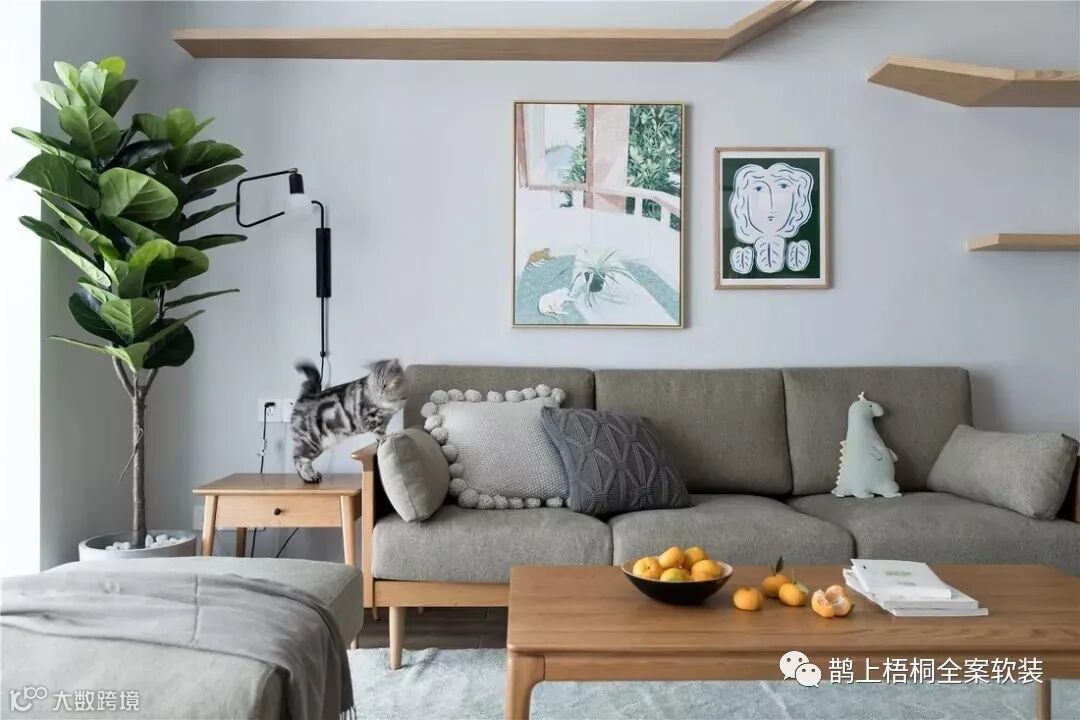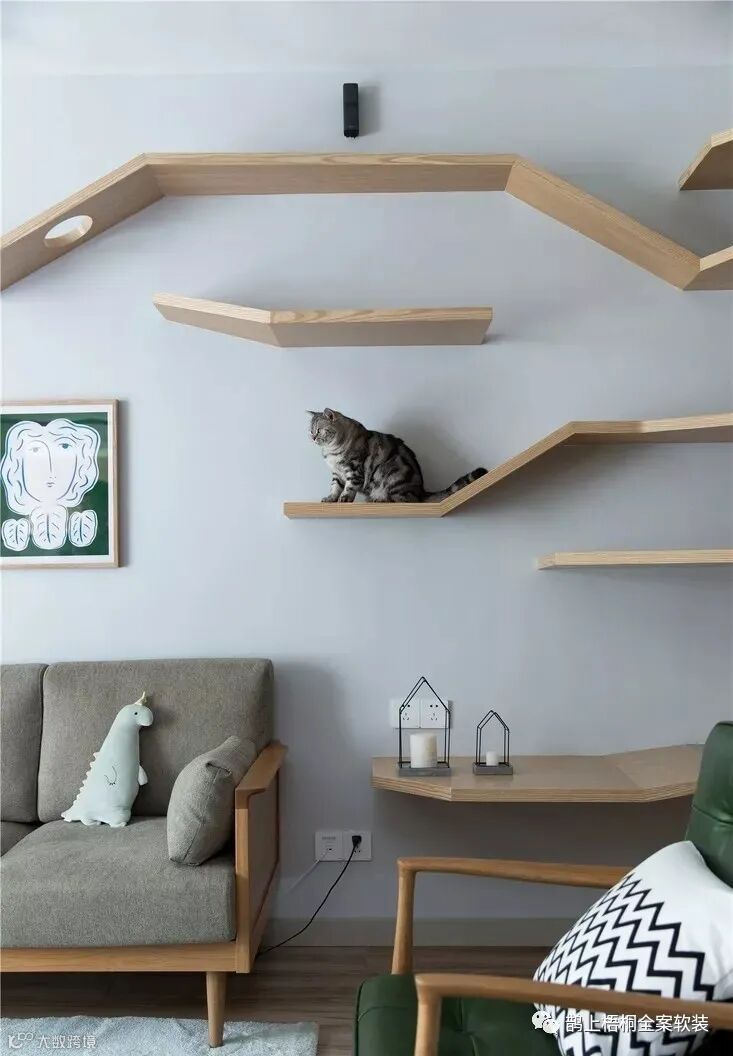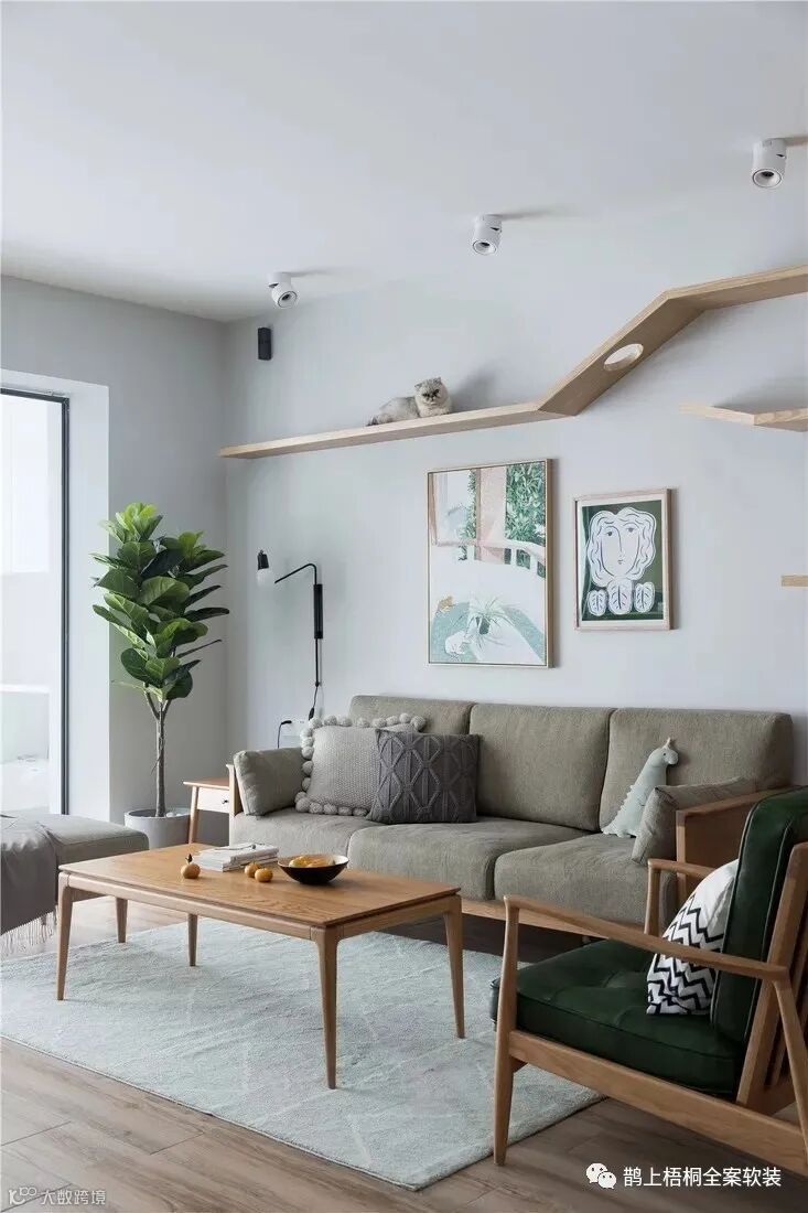 客厅是无主灯设计,大白墙的处理方式让空间更为明朗,布艺木脚沙发搭配木质茶几,清新自然。墙面不仅用装饰画衬托艺术氛围,最为出彩的就是为喵星人量身打造的墙面猫爬架,满足猫咪日常玩耍的同时,也更赋有设计感。