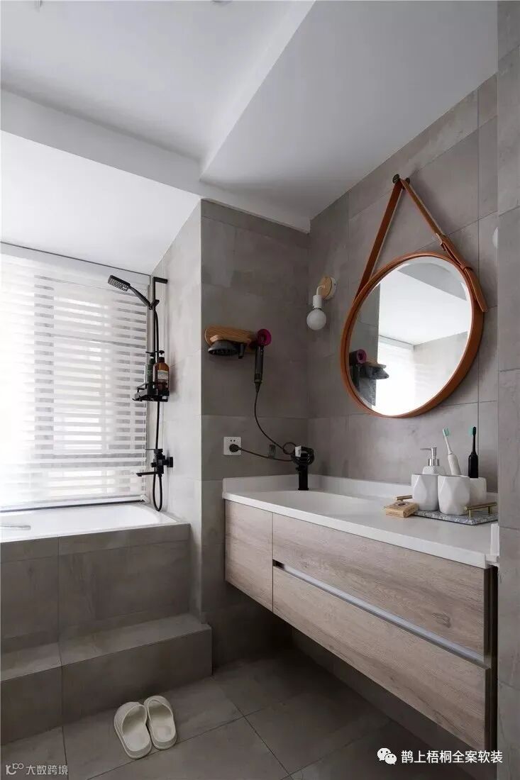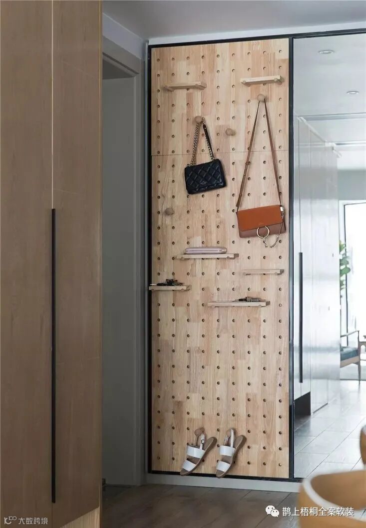 玄关除了常见的通顶柜处理,更安装了洞洞架,满足包包、鞋类挂放的同时,更有陈列展览的设计美感。大大的落地全身镜,让您的一天有个美好的开始。