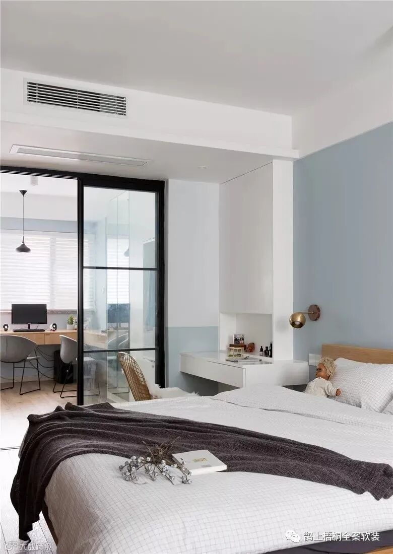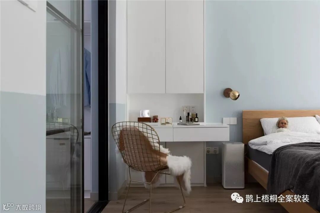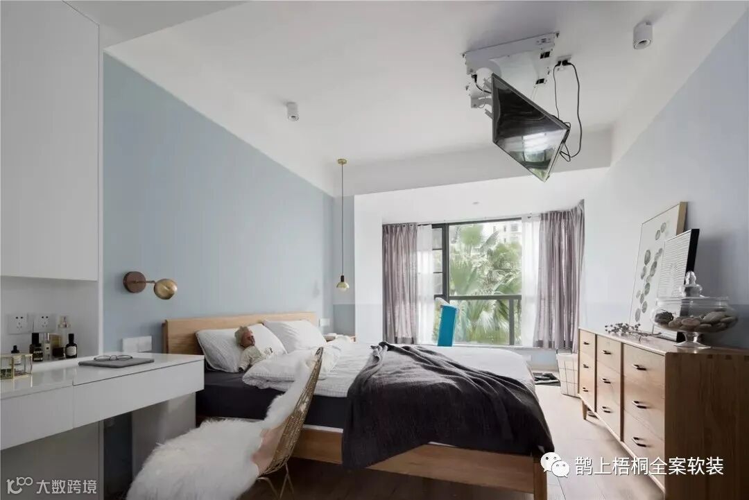 主卧安装了天花板电视安装架,躺平也要有格调!左边是梳妆台,为爱美的女屋主提供化妆的圣地。莫兰迪蓝色系的背景墙有助于一夜好眠,壁灯+吊线灯的灯光搭配让卧室在夜晚也能有个温馨的气氛。衣帽间兼并了书房的功能,既可以存放衣物,又能在写字台熬夜加班。