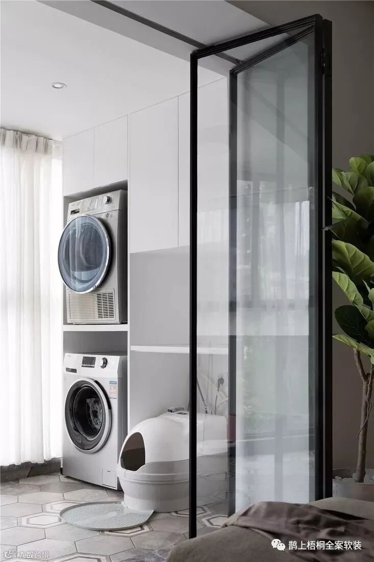 阳台预留了猫窝的位置,旁边就是洗衣机和烘干机,上方是储物的柜体,增加收纳。