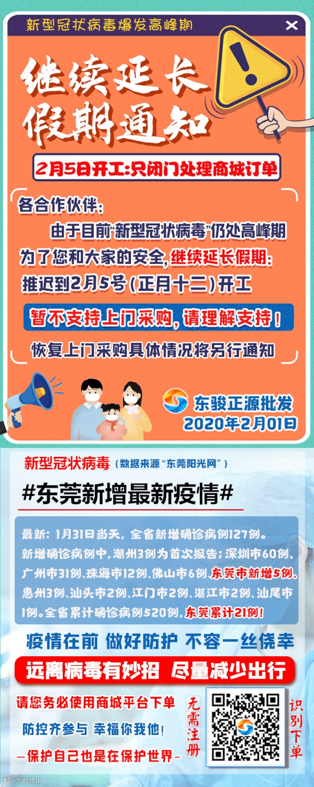 导读:延长假期至2月5日开工,闭门处理商城订单,暂不支持上门采购,特殊时期 敬请理解支持!