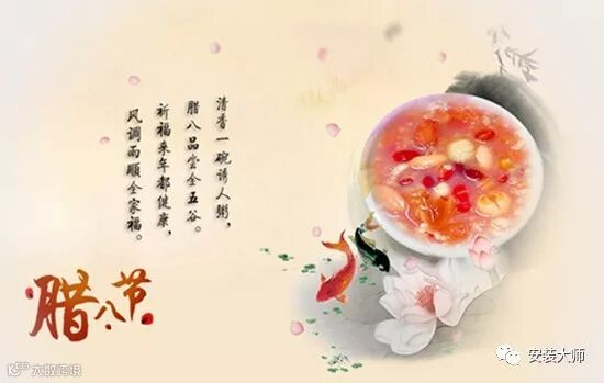 腊八粥:腊八这一天有吃腊八粥的习俗,腊八粥也叫七宝五味粥。我国喝腊八粥的历史,已有一千多年。最早开始于宋代。每逢腊八这一天,不论是朝廷、官府、寺院还是黎民百姓家都要做腊八粥。到了清朝,喝腊八粥的风俗更是盛行。
