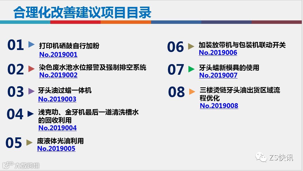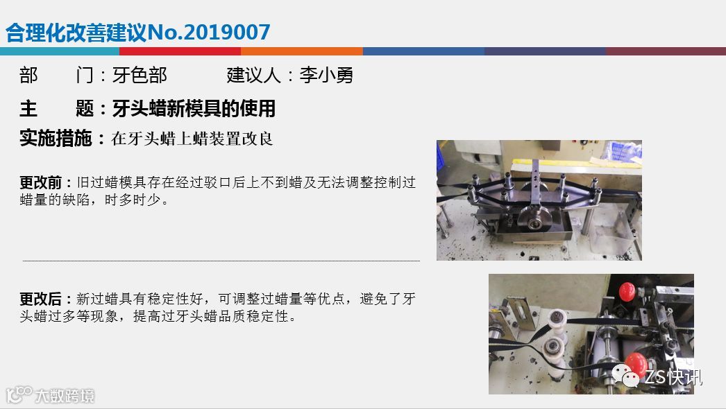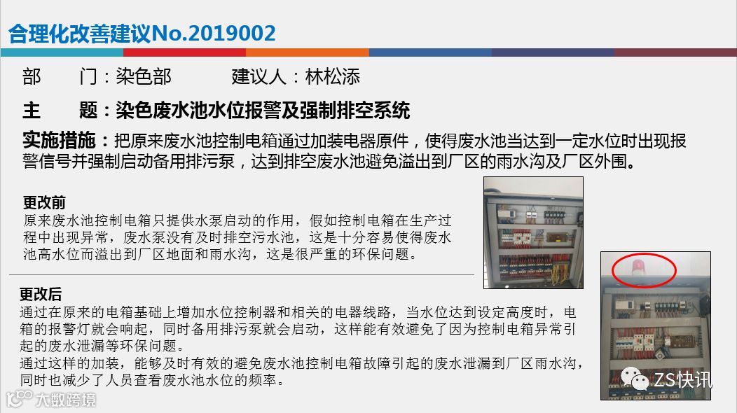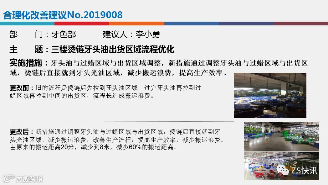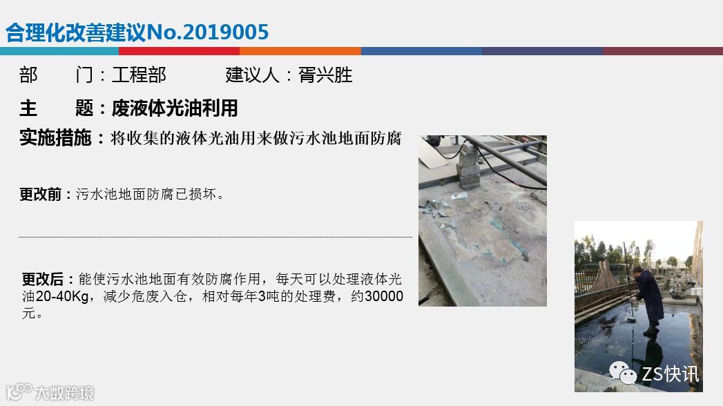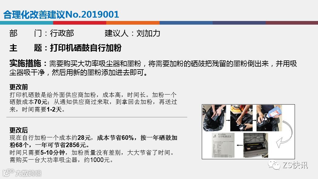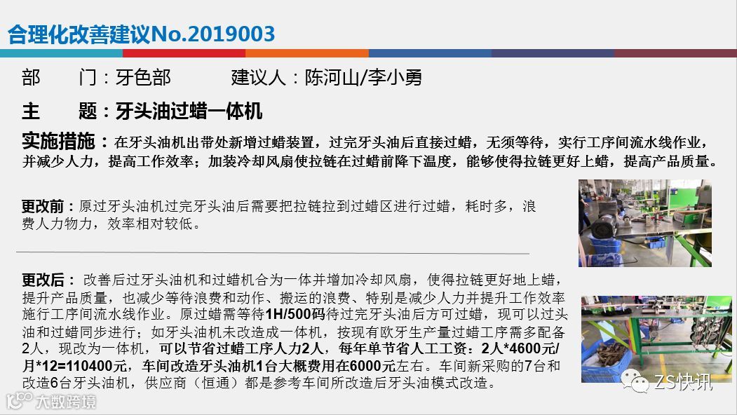 在合理化改善建议方面:各部门要有合理化改善建议的年度预定目标,然后分布到每个季度,各部门要鼓励员工多多提改善建议,全员参与,各部门在申报的时候要把握好合理化改善建议的质量,总体来说,今年我司评选改善项目偏重于以下3个方面,1.节能环保方面;2.设备自动化方面,3.安全生产方面。