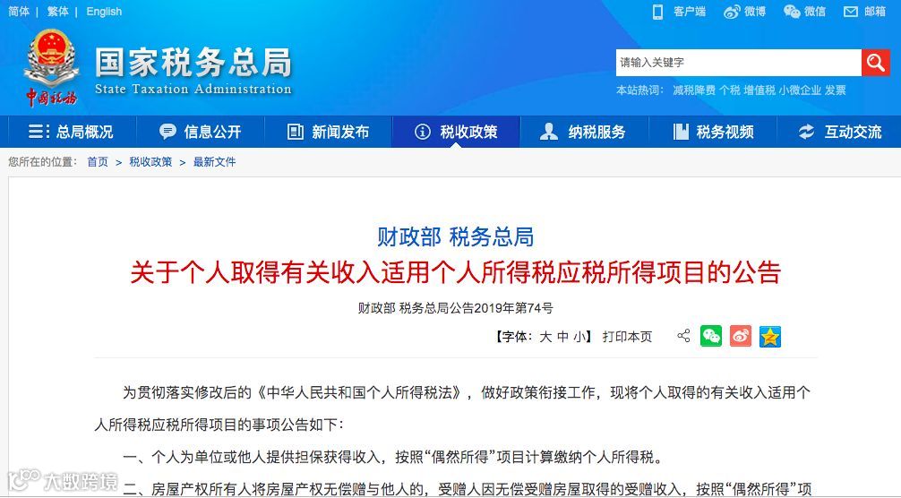 财政部、税务总局发布《关于个人取得有关收入适用个人所得税应税所得项目的公告》,将部分原按“其他所得”征税的项目调整为按照“偶然所得”项目征税,偶然所得适用税率为20%,与原“其他所得”税率相同,纳税人的税负保持不变。