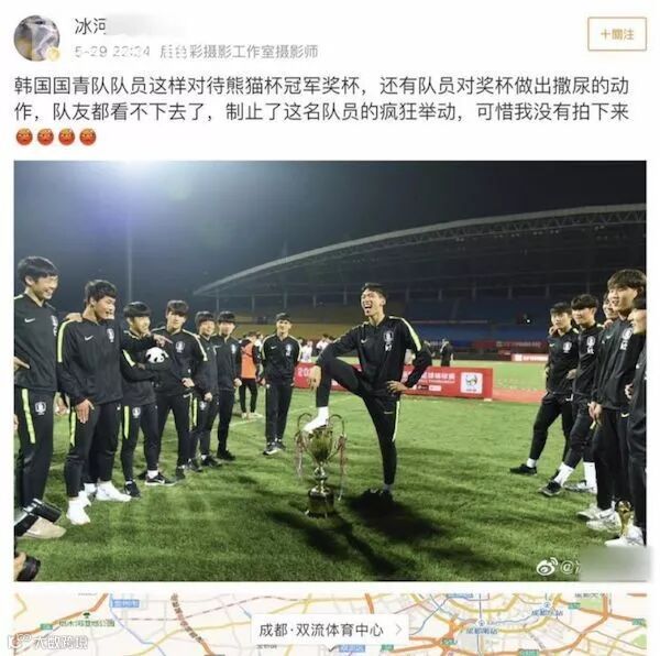 2019年“熊猫杯”国际青年足球锦标赛29日晚在成都收官。韩国U18国家队以三战全胜的成绩获得本届比赛冠军。但赛后有韩国U18国家队队员脚踩“熊猫杯”冠军奖杯庆祝胜利。此外有摄影师在网络社交平台指出,韩国队员还对奖杯做出了其它不雅动作。