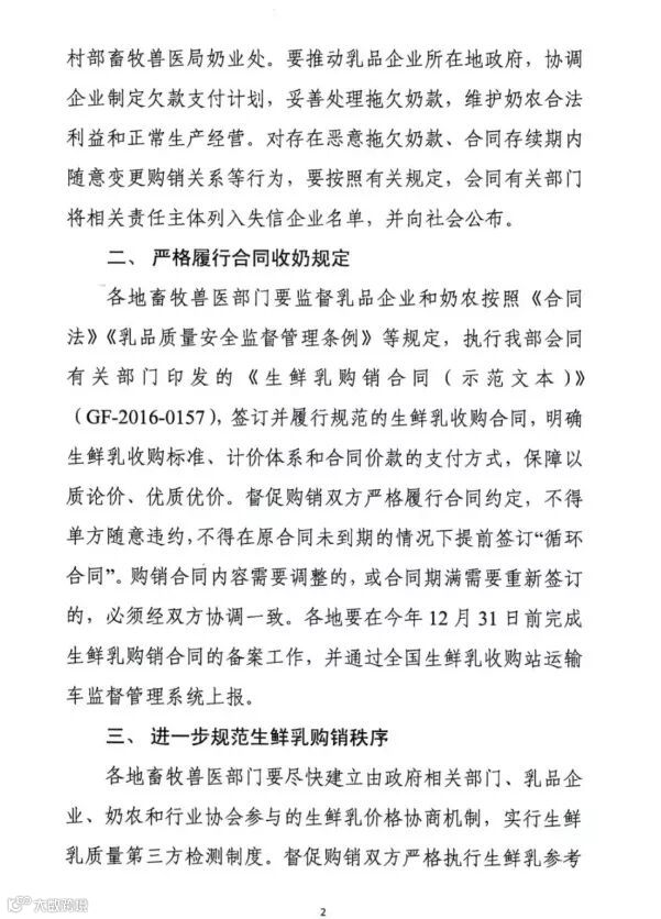 通知明确指出要尽快摸清拖欠奶农奶款情况,推动当地政府协调企业制定欠款支付计划,妥善处理拖欠奶款问题。后期要进一步规范生鲜乳购销秩序,切实维护奶农经营自主权。