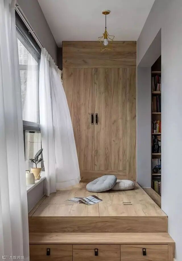 将榻榻米搬进阳台,瞬间多出一间房有没有!就连床底和墙面的空间也丝毫不浪费,做了抽屉和整墙的收纳柜,不住的时候还能变身储物间。
