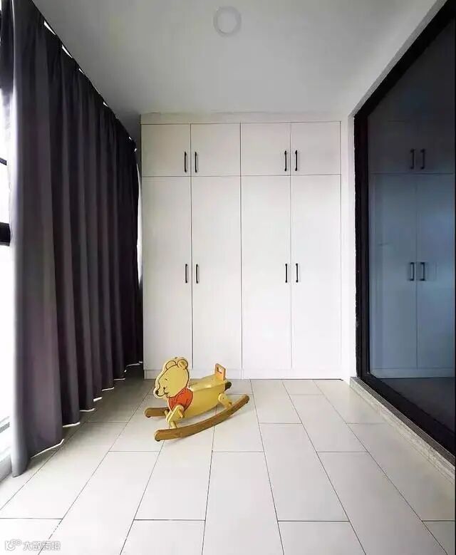户型小,没空间做衣帽间,就利用阳台做一个到顶衣柜吧,过季的衣服或者多余的被子存放在这里,还不占用卧室衣柜空间。