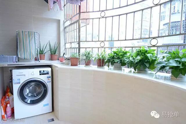 客厅阳台是弧形的,比较宽敞,可以晾洗衣物,摆放洗衣机!