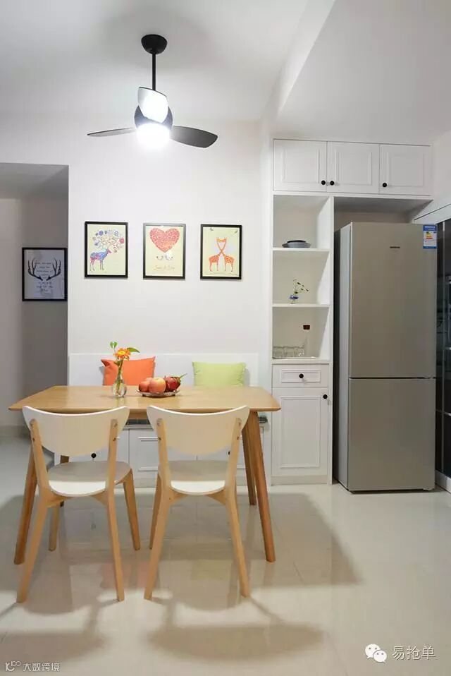 实木小餐桌,餐边小柜也是特别定制的,可以放冰箱~