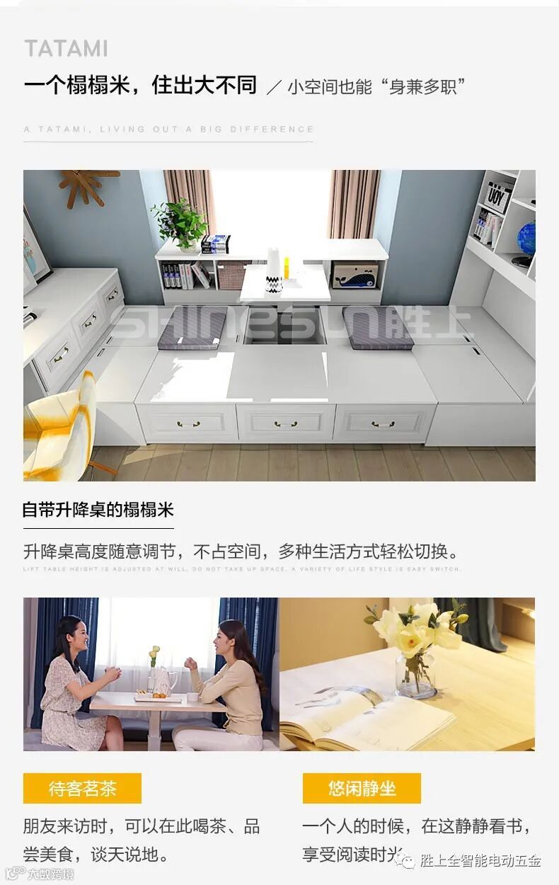 自动升降榻榻米将时尚实用与智能化人性化完美结合,实现了居室空间的多样化和灵巧性,使得家居环境更具品味、更加安全可靠。