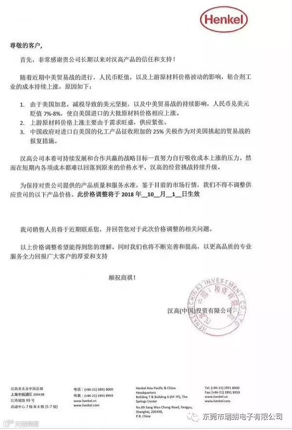 国际胶粘剂巨头汉高发布涨价函称,由于美国加息,导致美元坚挺,人民币贬值,以及中美互加贸易关税,使自美国进口的大批原材料供应价格走高;同时,市场供货紧张,更加剧了原材料价格上涨。成本压力之下,汉高将从10月1日起上调粘合剂产品价格。