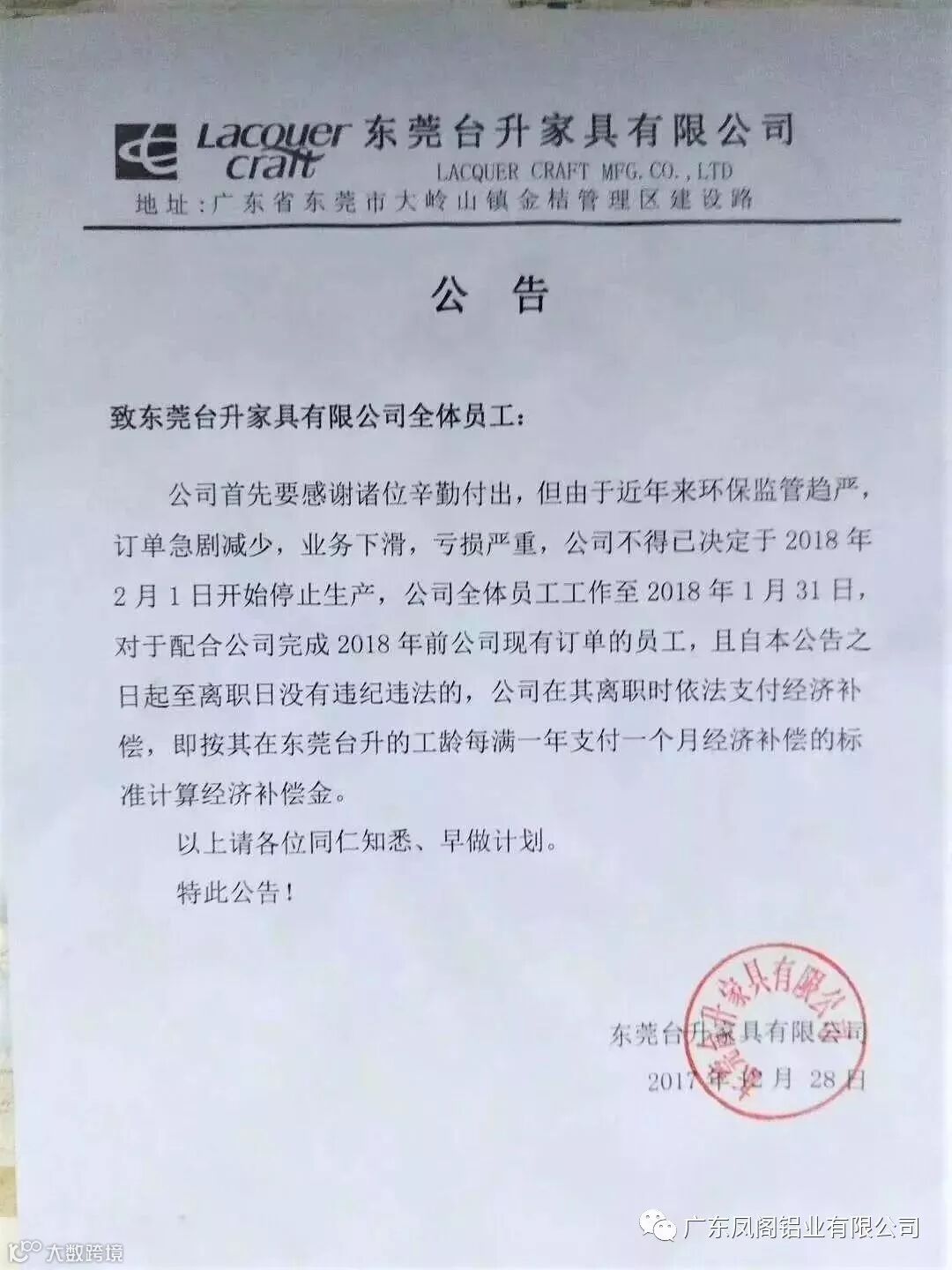 公司首先要感谢诸位的辛勤付出,但由于近年来环保监察趋严,订单急剧减少,业务下滑,亏损严重。公司不得已决定于2018年2月1日开始停止生产。公司全体员工工作至2018年1月31日,对于配合公司完成2018年前公司现有订单的员工,且自本公告之日起至离职日没有违纪违法的,公司在其离职时依法支付经济补偿,即按其在东莞台升的工龄每满一年支付一个月经济补偿的标准计算经济补偿金。
