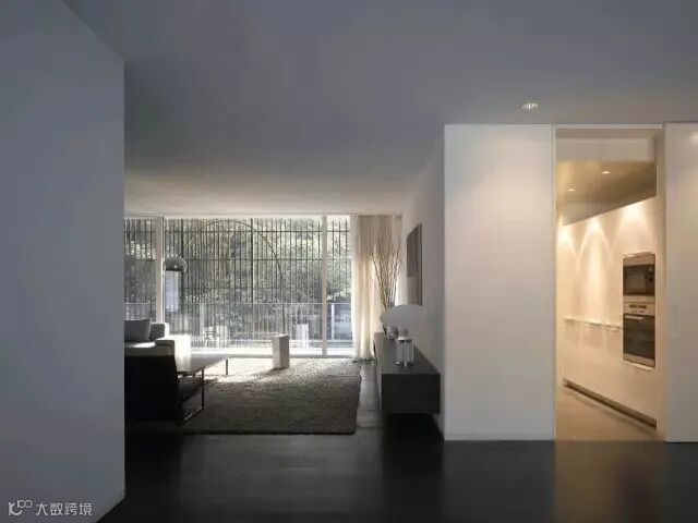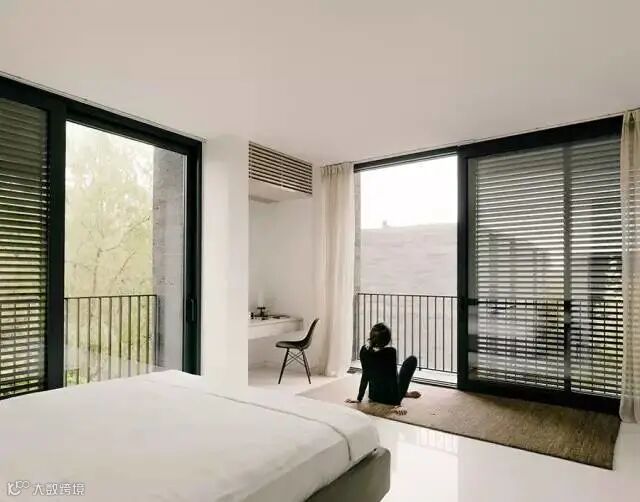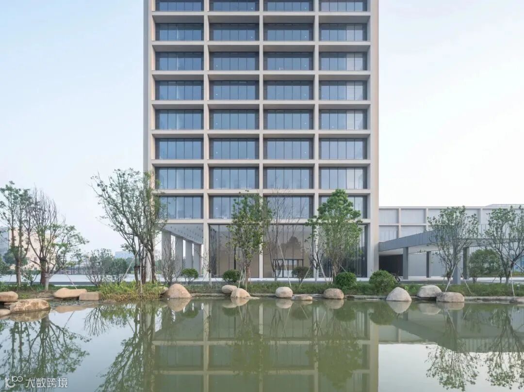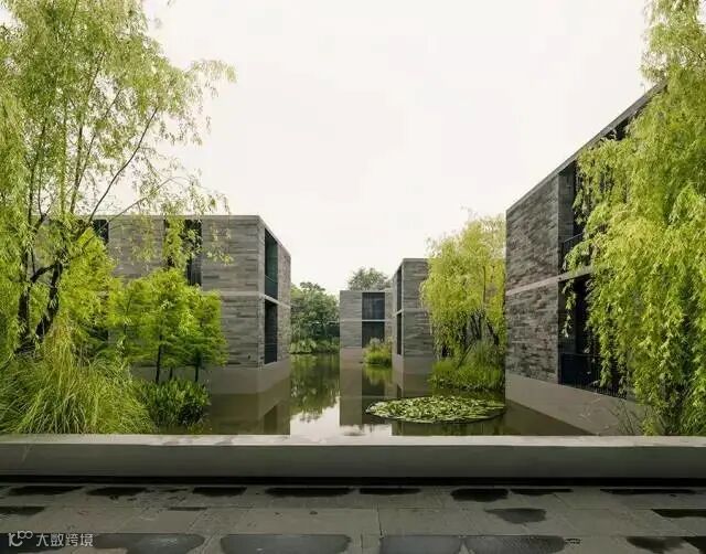 建筑被水系花园环绕,与湿地的地貌特征息息相关。建筑宛若镶嵌于水系花园中的黑色石块,与绿意盎然的周边环境形成鲜明的对比。和西溪湿地周边的村庄一样,项目建筑立于水中的石基之上。石基形成了村庄群落的基础,墙体、围栏和高低错落的平台打造了一系列室外空间,好似进入室内空间的序幕与前奏。建筑室内设计别具匠心,以流动空间呈现。与房间等高的大尺寸玻璃窗不仅为室内空间提供了充足的自然采光,住户亦可观赏到窗外水系花园的美好景致。