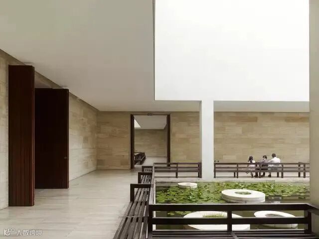 这座博物馆是由四条长方形体量构成的,它们宽度相同,长度和高度则各异。这四个体量之间通过大小、形态各异的庭院转换。博物馆深处的庭院以传统回廊的形式呈现——四面走廊环抱着花园或是池塘,显得尺度亲切。但博物馆入口处的庭院则是以和外立面一致的石材围合,仅仅点缀几棵大树,显得开敞、大气。这种对比强调了从室外进入博物馆,从开敞到围合的体验。