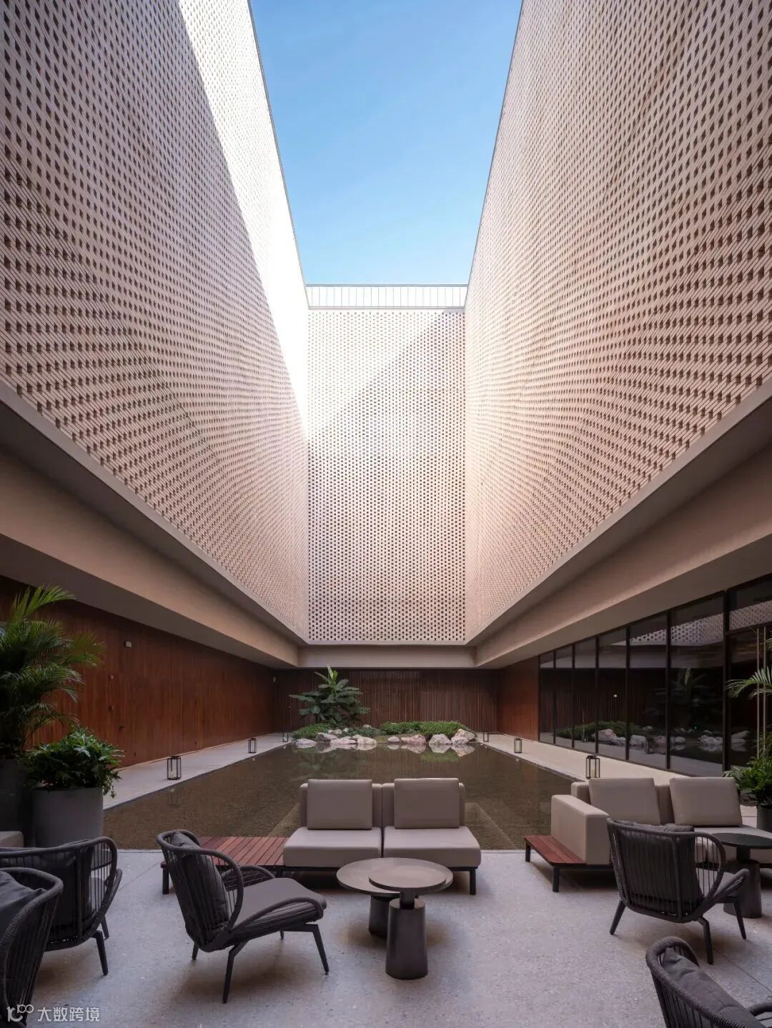 每个酒店建筑都有一个包含景观的内部庭院,人们可以在每个酒店的走廊内,透过穿孔的砖墙来欣赏庭院景观,从而建立一种归属感、宁静感和方向感。位于南侧、紧邻林荫大道的两座建筑中设有多功能厅,可举办各种公共活动。另外,1960年代建造的员工宿舍得到保留,并被整合到整个综合体中,以公寓式的建筑形式补充酒店的功能多样性。