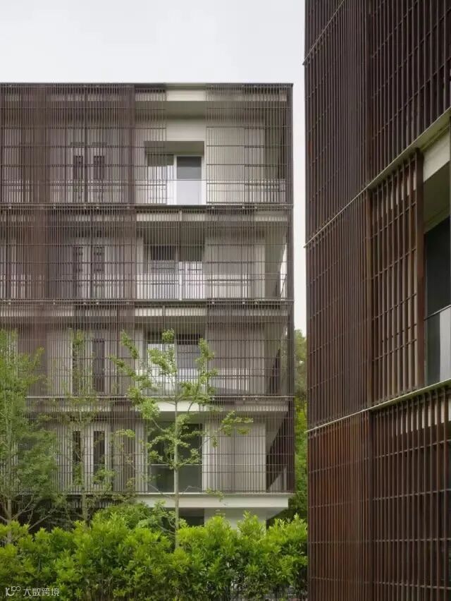 每一栋楼拥有五种户型,每户都占据整层约450平米的空间。从平面布局看,所有辅助功能位于几个实心体块中,实心体块之外是流动的室内空间。围绕着每一栋楼外表面的连廊,提供了室内居住空间和室外自然环境的过渡。向中国传统住宅学习,木制格栅的建筑外表皮在保护隐私的同时也为住户提供了遮阳。格栅可以根据需要左右滑动,其的密度依据室内功能、朝向和一些场地特性而有所变化。