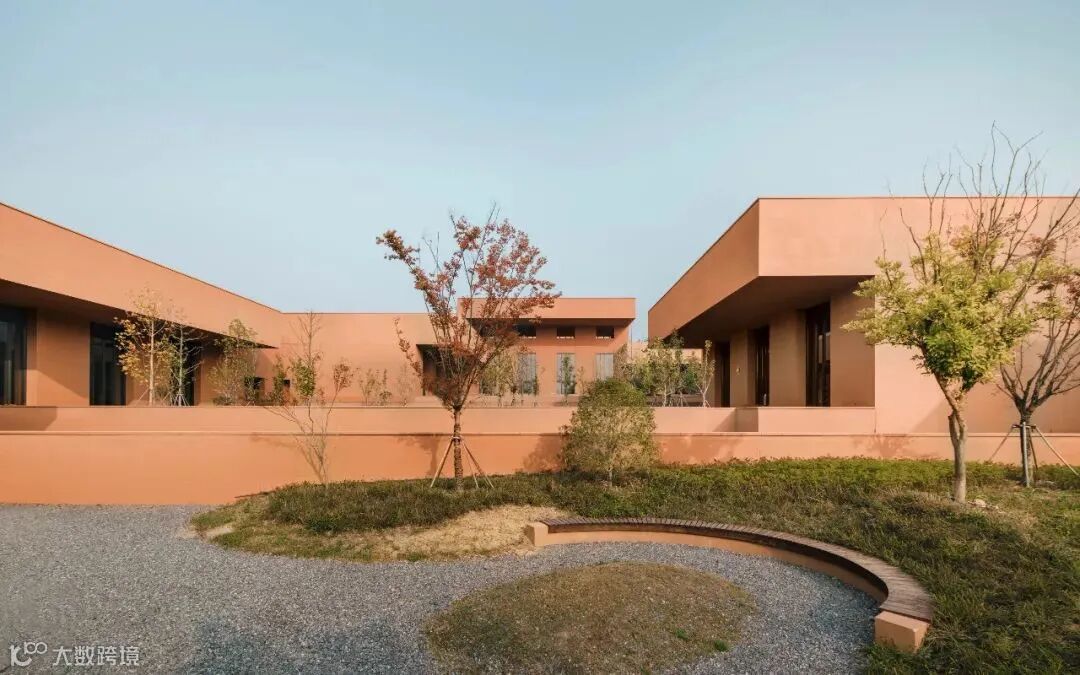 展厅坚实的建筑形式嵌入在中央庭院和周围公园的浓密景观中,植被延伸至绿化屋顶。建筑组群表面粉饰红赭色涂料,与场地山坡上的黏土颜色相近,强化了建筑和景观之间的联系。