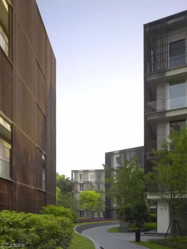 十二座单独的建筑体量以一种松散的方式排列,以保证每栋楼之间的充裕的室外开放空间。建筑之间种植茂密的植物,让每一栋楼都可以享有自己的一片绿地。这十二栋楼的排列顺应了地势,并以不同的角度放置,使景观自然地渗入。小区入口在南侧,网状的步行道联系各个公寓楼;车行完全在地下层,每一栋楼都与地下车库相连,保证了地面无车的宜人环境。