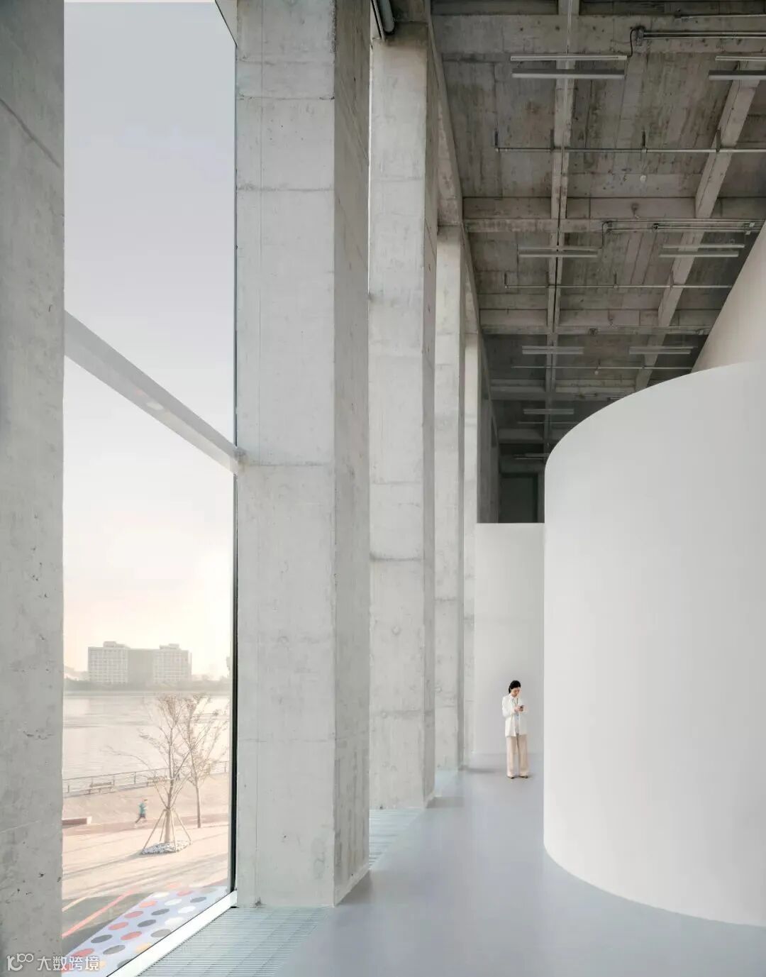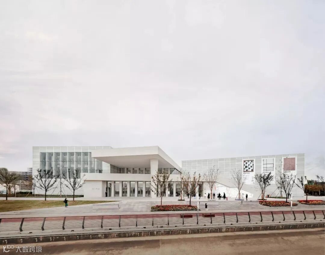 三个主要建筑体量均为17米高,分别由上层和下层组成。每个体量的上层为通过顶部采光的展览空间。下层的空间的功能更为多样,包含多功能厅、艺术工坊和教育空间。这些半地下空间,利用侧高窗采光。咖啡厅位于滨江侧首层的低矮体量内。它修长的造型试图将更多的江景带给参观者,同时也为二层入口创造了一个宽敞的露台。