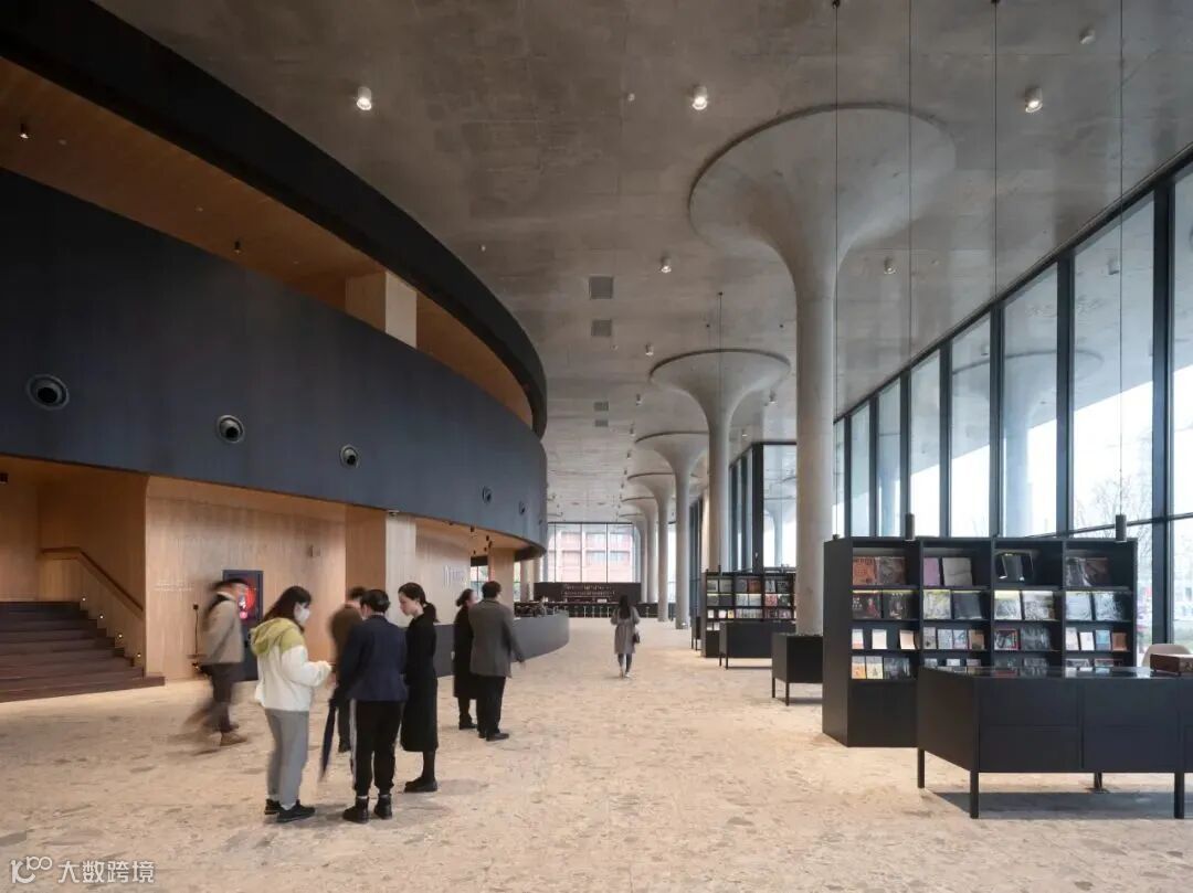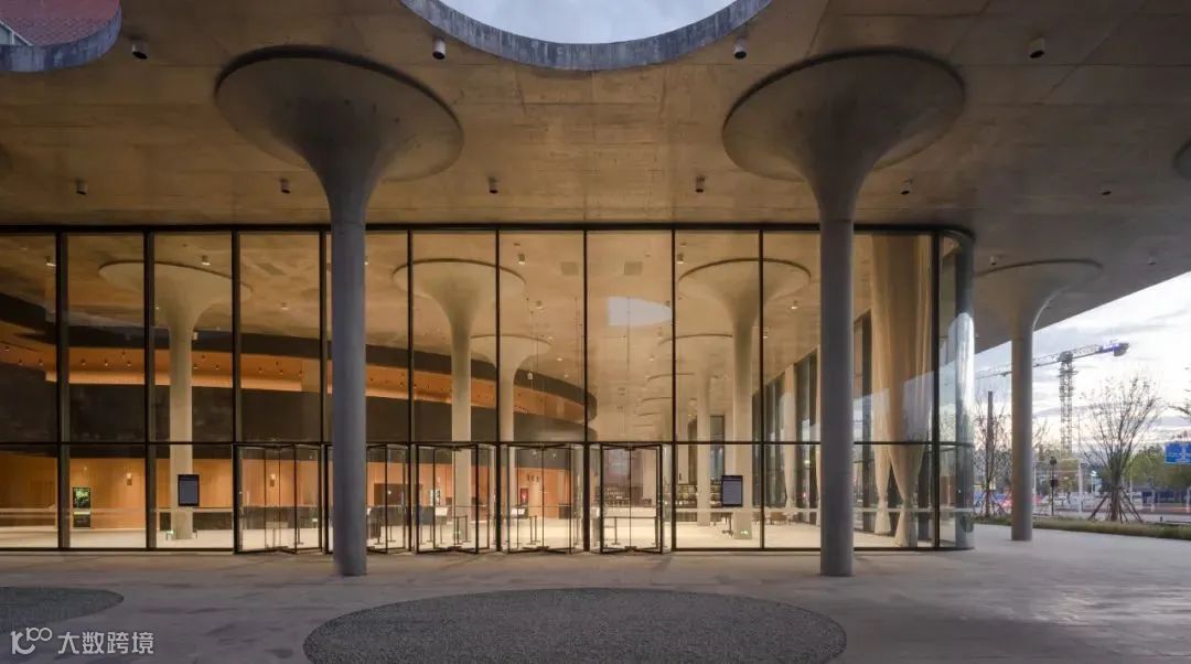 大剧院的两个演绎空间都通过首层宽敞的门厅进入,该门厅同时将建筑物向林荫大道敞开。马蹄形观众厅嵌入门厅中,被木饰面的衣帽间和上层前厅所包围。现浇蘑菇形立柱支撑着门厅的屋顶,让林荫大道的景观不断渗透到大剧院的内部。连续的大理石地面进一步强调了内部空间与外部空间之间的联系。弧形的观众厅从门厅屋顶上方凸起,以镂空砖块的形式呈现,在夜间像明亮的皇冠一样闪耀,并为这个新的场所增添标志性。