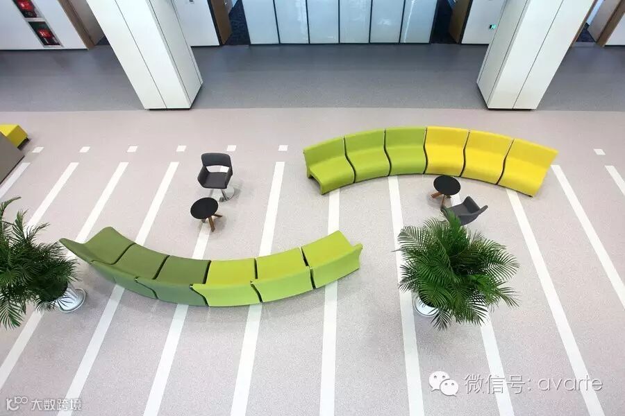 一楼大堂为大面积开放空间,视野开阔,整体环境以白色/灰色为主色调。弗莱克思与博克思系列均为模组化家具,可以根据需要形成不同模式的组合,灵活多变。大胆的配色,活泼了整体氛围。同时在等候区内穿插设置洽谈区,丰富了等候区的功能。