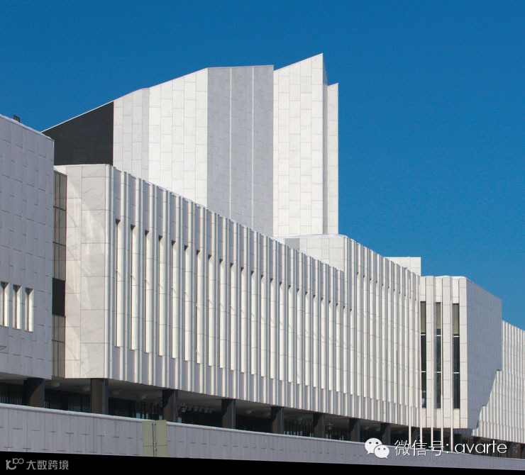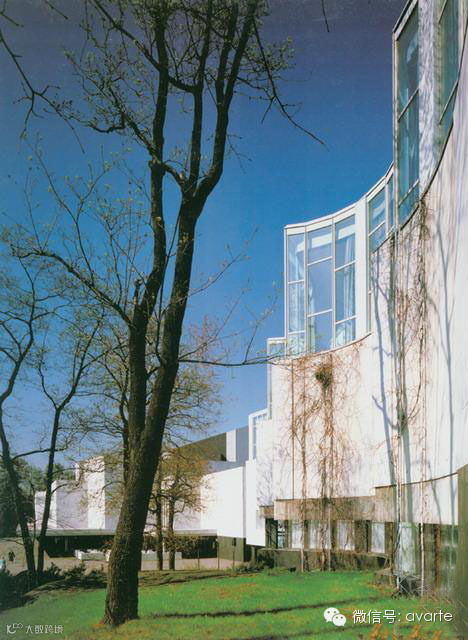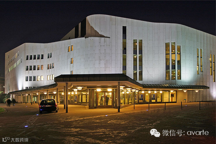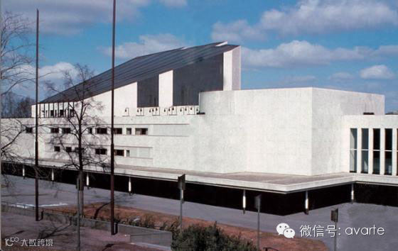 一个宽敞的悬挑楼梯问通向观众席、餐厅等休息大厅。窄些的楼梯(其中一个在东立面悬挑出来)从主大厅通向包厢休息厅和主观众席入口。观众厅包括1750座的交响乐厅、350座的小型室内乐厅以及各自的休息室、餐厅和厨房、会议楼的会议厅休息室等。特别应该指出的是,交响乐厅与其余部分的混凝土结构从基础起就互相脱离,加上特殊音响节点设计,可以排除噪音干扰。外立面采用白色大理石,基座为黑色花岗岩。临湖外墙用竖向线条分隔墙面,这是片断组合的风格派手法。西立面在有树的地方开了大面积窗户和圆形的窗洞,使立面生动起来。