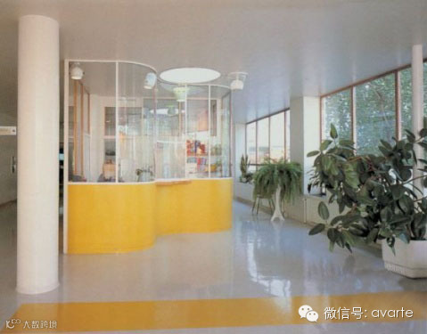 疗养院室内黄色的地面给人一种温暖关怀的感觉,楼梯扶手的巧妙设计,转角处也被做成弧形,不比做成直角来的那么尖锐,甚至疗养院内各处的墙角也被做成弧形,这是一种人性化的关怀,再就是这样设计打扫卫生的时候更加方便。病房里的玻璃也是双层的,寒冷的空气进入室内前就已经被预热。可以说阿尔托的人性化设计体现在建筑的每个细节。