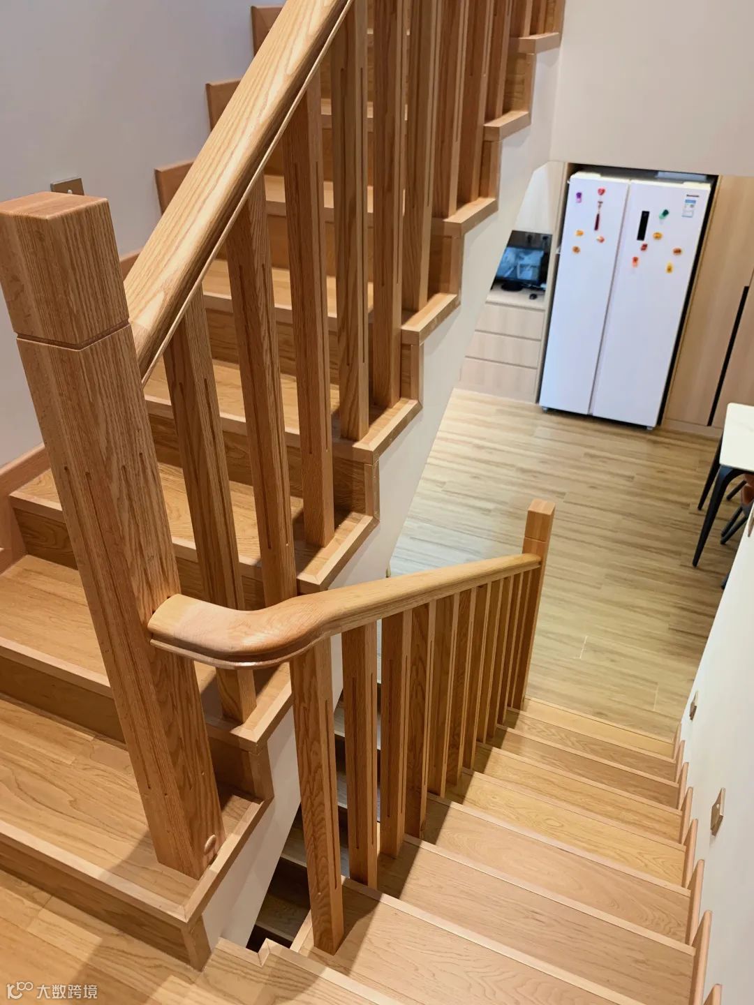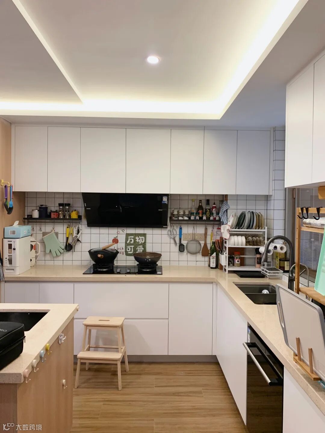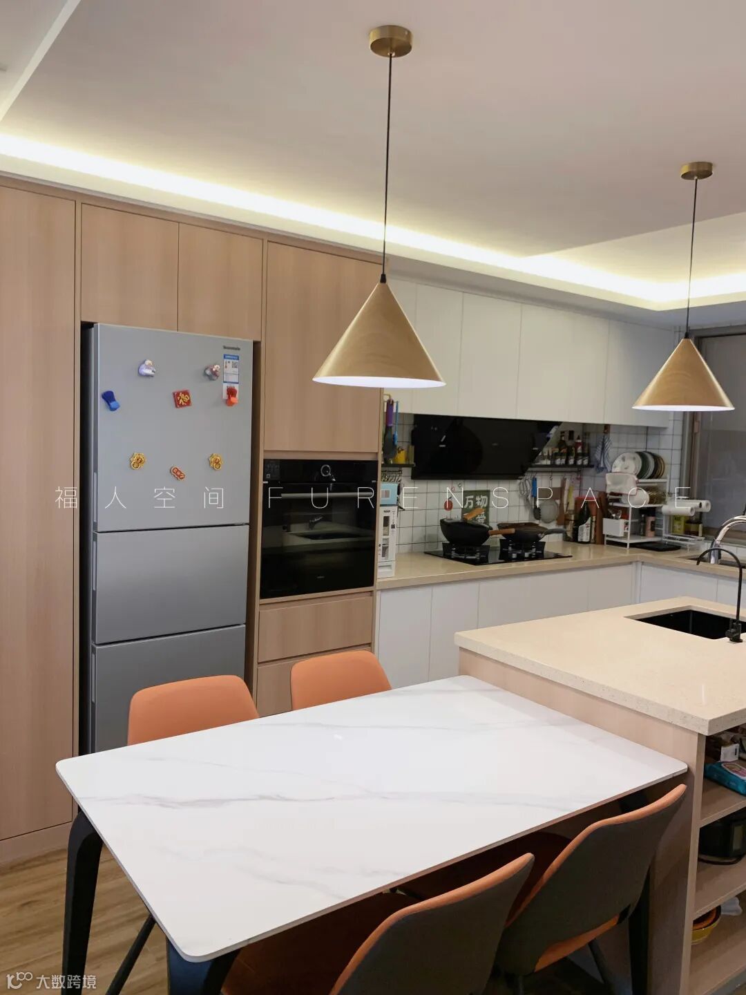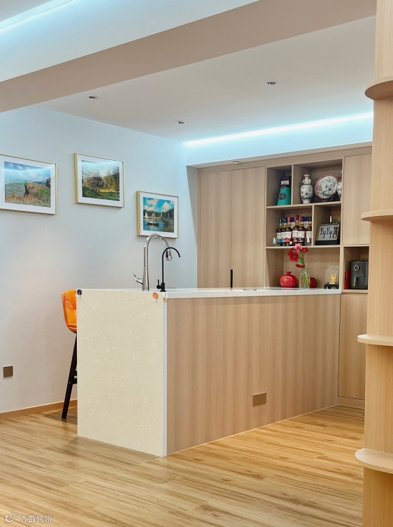 厨柜用白色的柜门,与餐厅的原木色